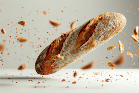 Levitating French Baguette Country Bread Studio Shot Cream Gray Background Minimalist