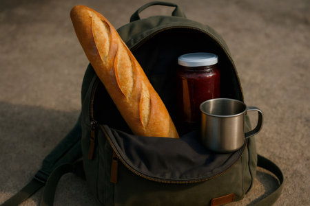 Green canvas backpack open showing a fresh baguette, jam jar, and metal mug, ready for a hiking trip or picnic
