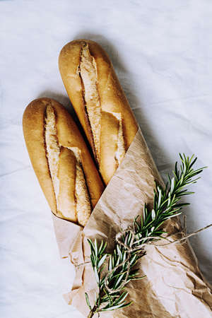 Traditional French baguette in recycled brown bag over white textile background decorated with rosemary. Sustainable package zero waste concept. Flat lay. Top View