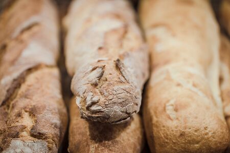 Fresh bread on the counter in the store, close-up . Healthy food and organic products.