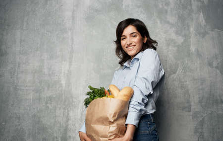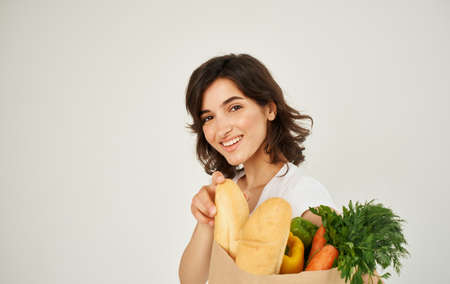 cheerful woman in a white t-shirt package with groceries from the supermarket health