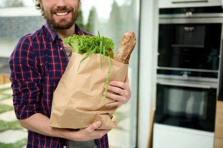 Close-up eco paper bag, craft cardboard packet with greens, salads, healthy food, whole grain baguette bread in hands of handsome caucasian guy smiling beautiful toothy smile standing in home kitchen