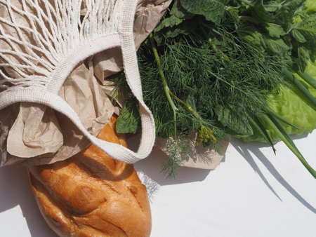 Bread in paper and fresh natural vegetables in a mesh bag on a white background. Zero waste, shopping concept. Sustainable lifestyle. Top view, flat lay. Close-up.