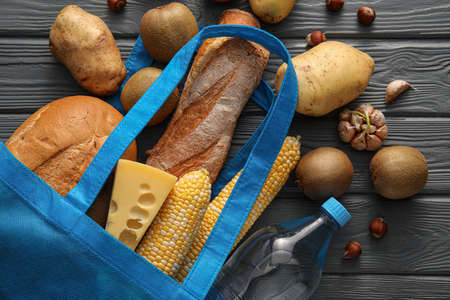 Eco bag with different products on wooden background