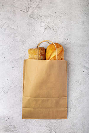 Disposable paper bag from a supermarket recyclable with whole baked loaves of bread flat lay on gray background with copy space.