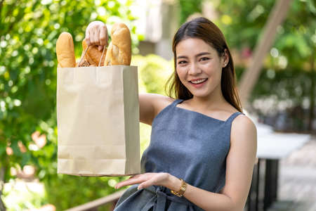 Close up of asian smile woman housewife holding variety bread in disposable paper bag on grey vintage loft background. Bakery food and drink grocery and domestic life lifestyle concept for delivery.