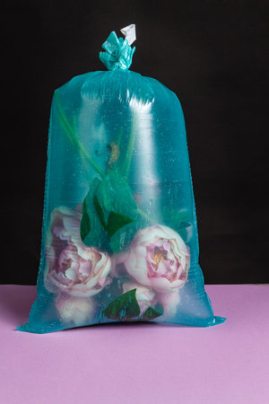Vertical shot of plastic bag filled with water and flowers. Enviroment pollution concept.