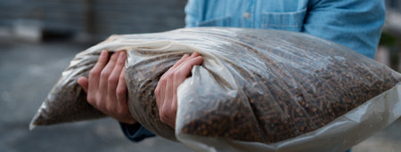 Man holding bag with wood pellets, pellet fuels manufactured in wood pellet line. Reusing wooden industrial waste.
