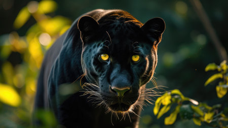A fierce black panther with luminous amber eyes moves stealthily through shadowy greenery, its sleek form highlighting raw agility and unmatched focus.
