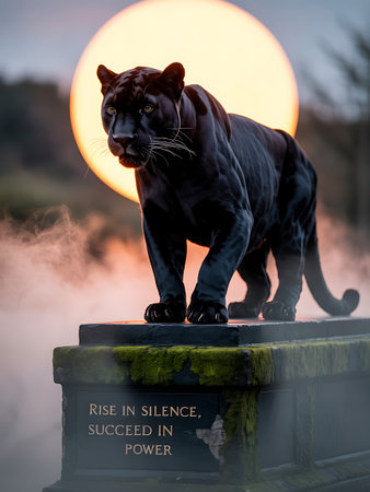 A sleek black feline streaks through foggy woods, its piercing eyes and fluid movement embodying raw agility and silent strength amid a mystical landscape.
