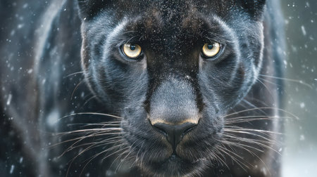 A powerful black feline gazes unwaveringly amid snowy drifts, its piercing eyes and intricate whiskers highlighted by crystalline winter?s glow in a shadowy landscape.
