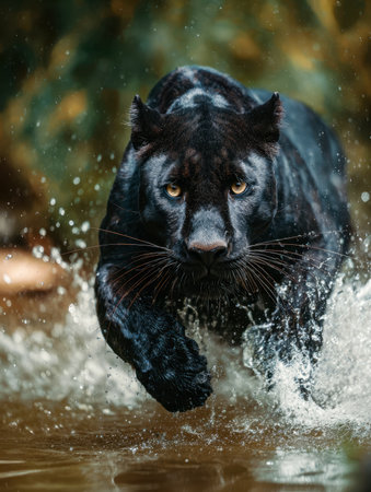 A sleek black feline forces its way through rippling currents, eyes locked on prey, embodied strength and relentless determination.