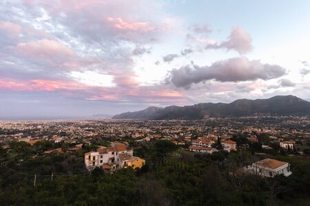 Monreale Landscape Winter Sunset. Deep Purple Sky. View on Palermo on the Island of Sicily in Italy, Europe