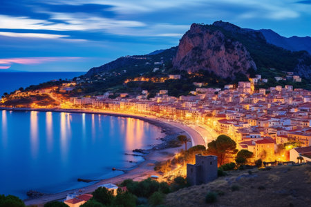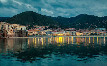 the promenade of a small town Cefalu at dusk, Sicily, Italy