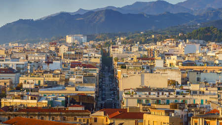 Panoramic top view of the local buildings with the trees, mountains and the sky in the beautiful city of Messina in Sicily, Italy