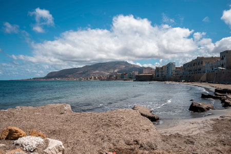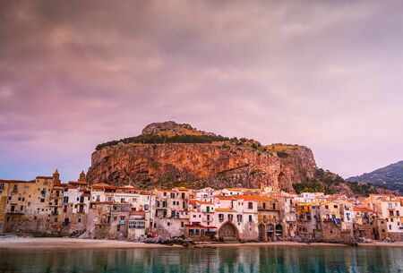 Amazing old houses on the coast of Tyrrhenian sea in beautiful Cefalu, Sicily, Italy. Behind the buildings marvelous rock overlooking the coast. The Sicilian city is a popular tourist attraction.