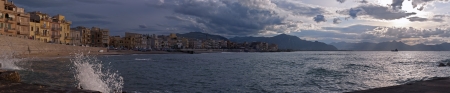 Palermos promenade with the harbor and Mount Pellegrino in the background, Italy