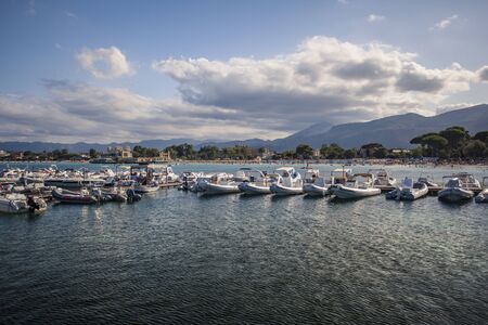 Nea Makri harbour, Attica Greece. Fishing boat moored in Aegean calm sea. Destination for vacation at city background. Greek sun and blue sky.