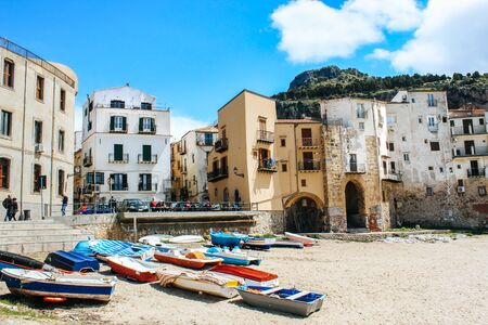 Cefalu, Sicily, Italy - Apr 7, 2019: Beautiful old harbor in small Sicilian city. Boats on a sandy beach. Traditional houses, mountain in the background. People on the promenade. Sunny day.
