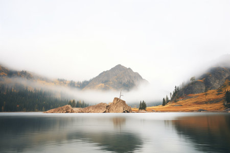 Mountain lake in the fog. Beautiful summer landscape in the mountains.