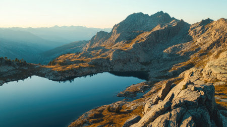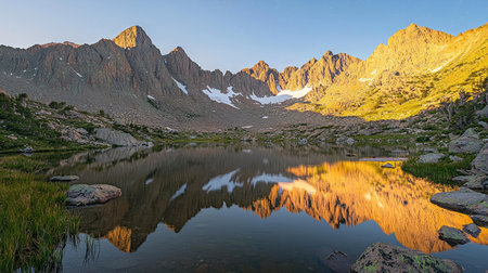 This stunning mountain landscape captures a serene lake reflecting the surrounding peaks at sunset. The golden light illuminates the rugged cliffs, creating a peaceful atmosphere ideal for nature lovers.