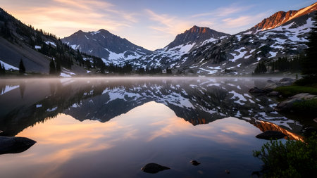 Misty lake with perfect reflections of snow-capped mountains during a vibrant sunrise, tranquil alpine wilderness scene.
