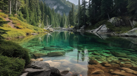 Mountain lake with crystal clear turquoise water surrounded by green forest