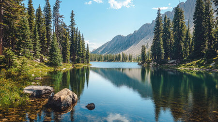 A tranquil alpine waterbody reflects jagged summits and dense pine woods, evoking calm and awe amidst untouched wilderness under clear blue skies.