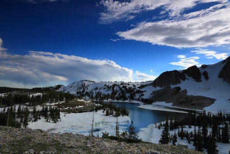 Snowy mountains reflecting in Mirror Lake, in the Uinta Mountains, Utah
