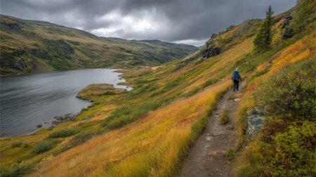 person, taking a break from the trail and enjoying the view of a lake, created with generative ai