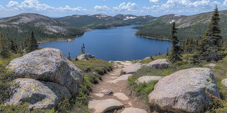 Scenic Hiking Trail Overlooking a Tranquil Mountain Lake in Summer