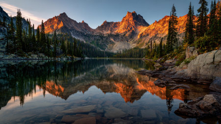 Coniferous showing mountain range reflected in a calm blue alpine lake during golden hour sunset keywords: mountain,...