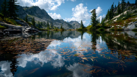 Explore the stunning view of a tranquil mountain lake embraced by towering peaks and lush forests, capturing nature's beauty under a bright sky filled with clouds.