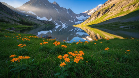 A scenic view depicts a mountain lake with reflections. Bright orange wildflowers bloom in the foreground. The composition highlights natural elements of sunlight and shadow. This image is suitable for various commercial uses, including travel brochures and editorial content.