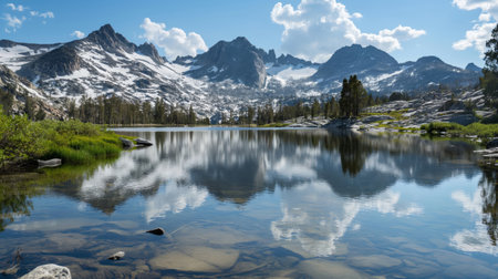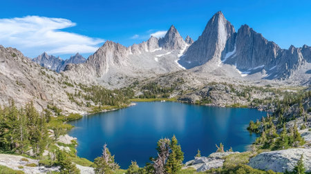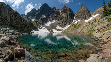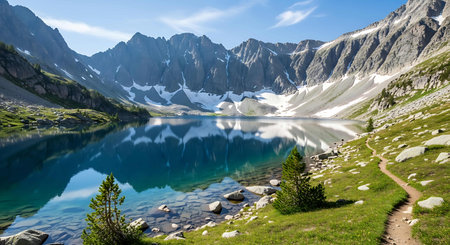 A breathtaking scene of a serene mountain lake surrounded by rugged peaks, reflecting the clear blue sky and vibrant greenery, perfect for nature lovers.
