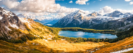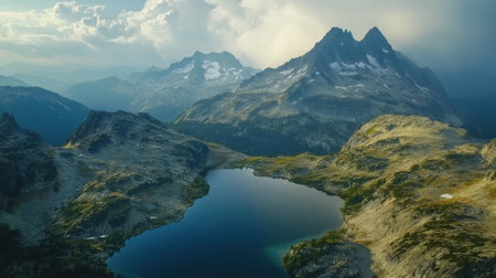 Aerial panoramic view of majestic mountain lake with serene landscape, rugged peaks, and untouched alpine scenery reflecting in clear skies, perfect for outdoor adventure and pristine nature tourism
