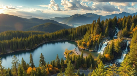 Aerial view of a mountain lake surrounded by coniferous forest at sunset