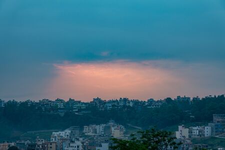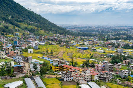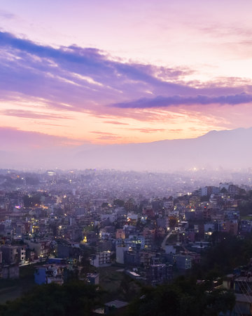 Beautiful panorama sunset over Nepal capital Kathmandu city with colorful buildings from viewpoint with Himalayas mountains background