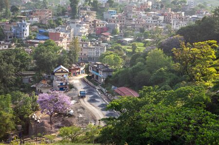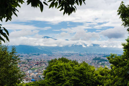 Panoramic top view of Katmandu city, capital of Nepal. Trees on foreground, stock photo.