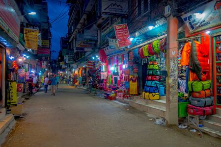 THAMEL, KATHMANDU NEPAL - OCTOBER 02, 2017: Night view of streets of Thamel. Thamel is a commercial neighbourhood in Kathmandu, the capital of Nepal. One of the popular tourist attraction in Kathmandu