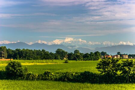 Fields, forests, mountains and blue sky.Side-by-side The countryside of Nepal is an ancient house that is still preserved. Old culture