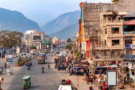 Kathmandu, Nepal - December 29 2019: Vehicles making their way through the main street of the city