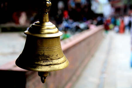 Kathmandu, Nepal - January 29 2021: Buddhist Manuscripts inscribed on the golden bell with Boudhanath Stupa in the background.