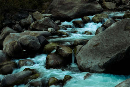 Huge rocks on a mountain river in the Himalayas in the spring day, Nepal.
