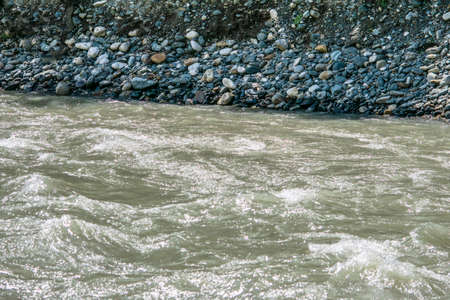 Mountain river flowing near stone coast. Clean waterway flows over stones in sunny weather.