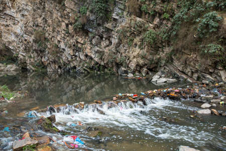 Environmental pollution in the Himalayas. Garbage in the water of river.