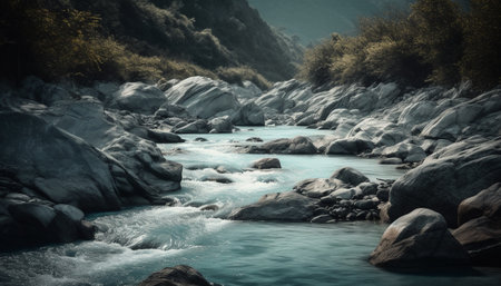 Tranquil scene of majestic mountain range with flowing water and forest generated by artificial intelligence