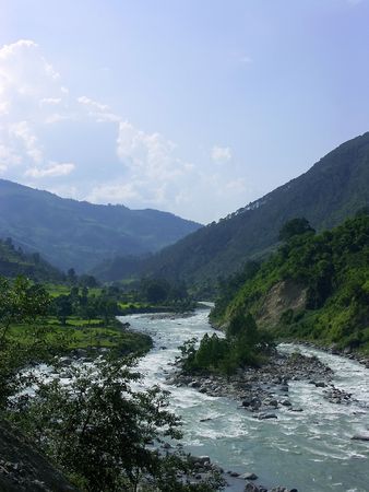 A panoramic view on river and Himalayas from Annapurna Circuit Trek, Nepal. Turquoise color of the river, big stones popping out of the river. Green forest around. Idyllic landscape.