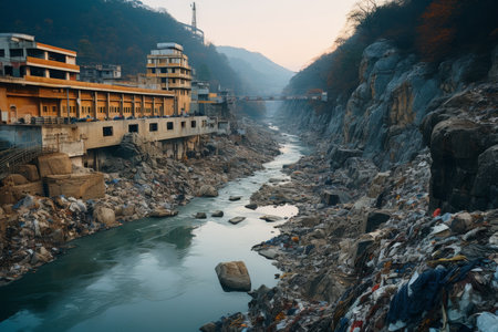 plastic garbage waste dump in mountain river next to the industrial plant on the cliff, aerial view