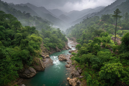 High-angle view of a verdant valley, featuring a river winding through a dense forest and rocky terrain. The image evokes a sense of tranquility and natural beauty, with misty weather conditions creating an atmospheric effect. The scene is dominated by lush, green vegetation and the flowing river, highlighting the natural splendor of the area.